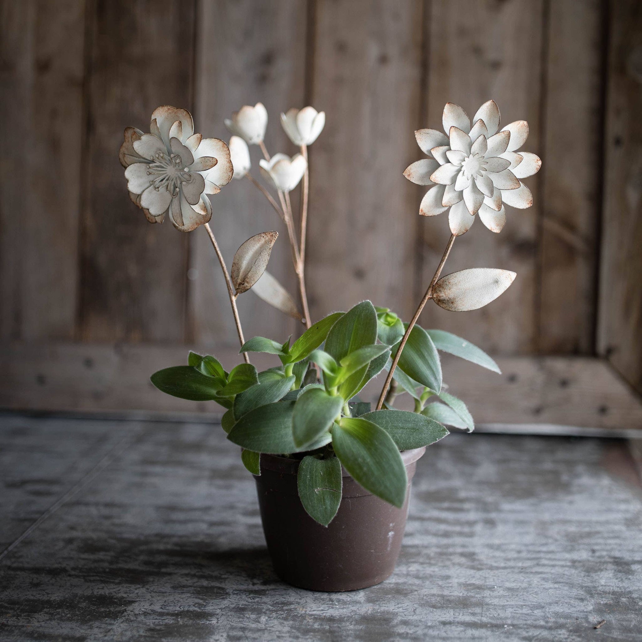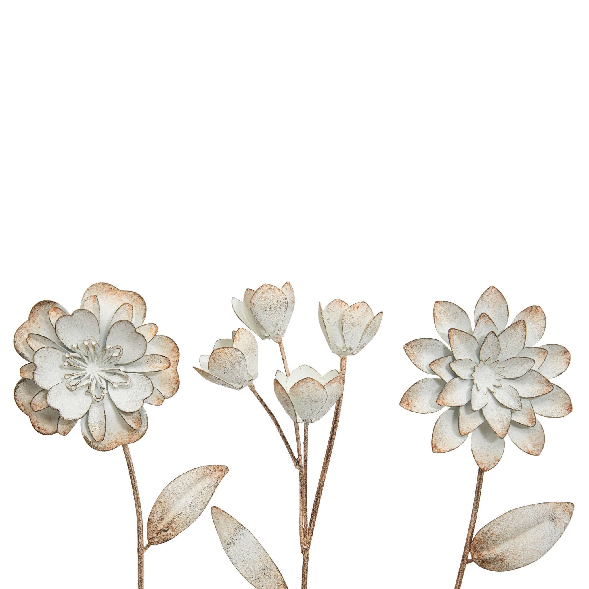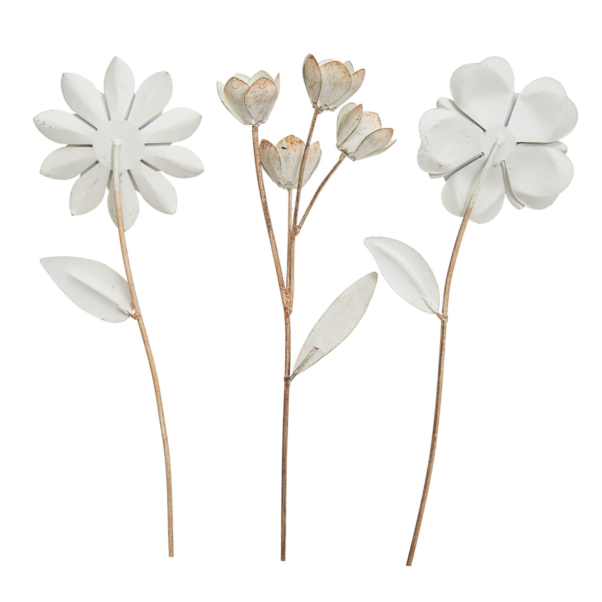 A matte white finish is the base for an antiqued bronze brushing over the three botanical stems, each featuring a different flower. Their color makes these stems a neutral yet beautiful accent. Create a bouquet with all three or use as planter pot stakes.