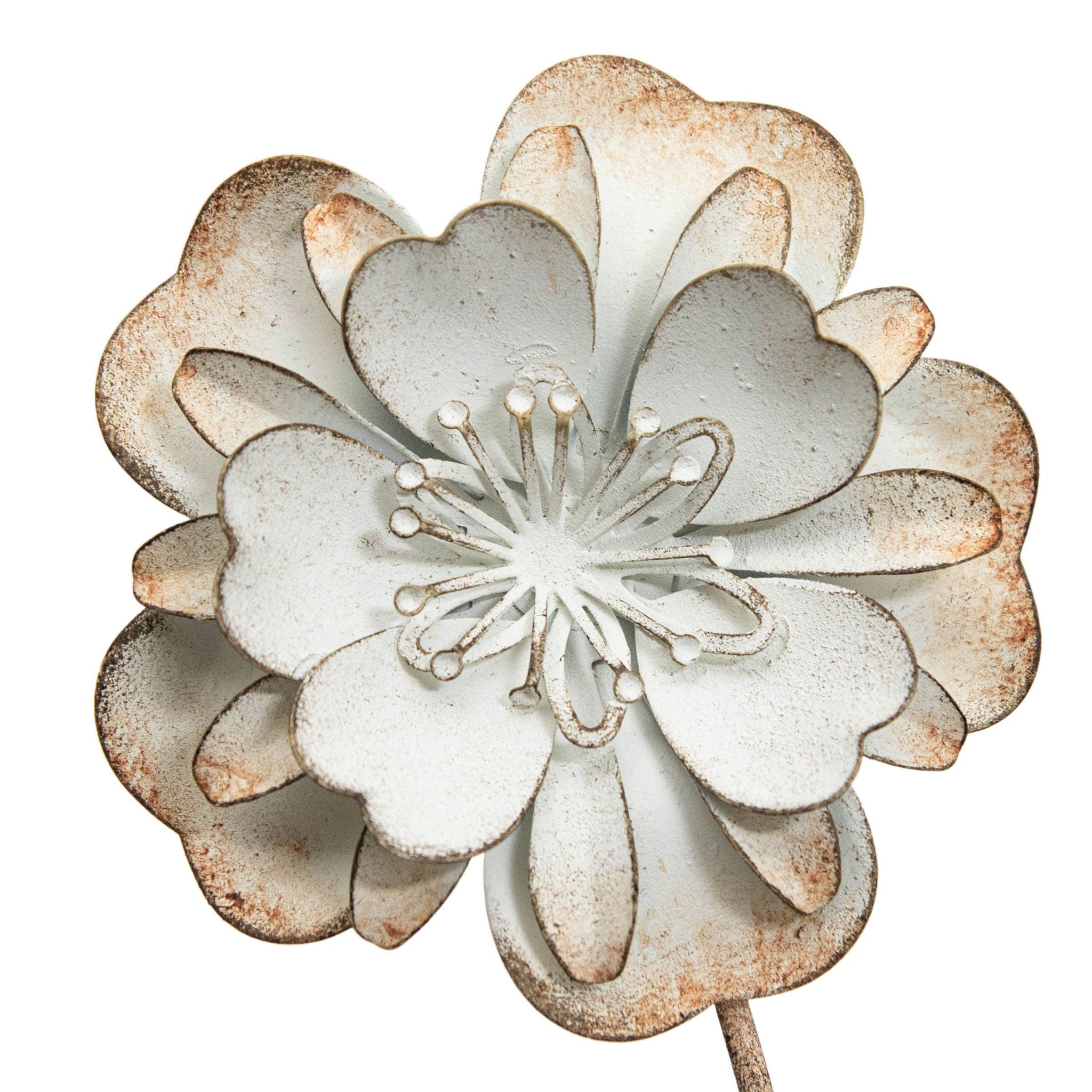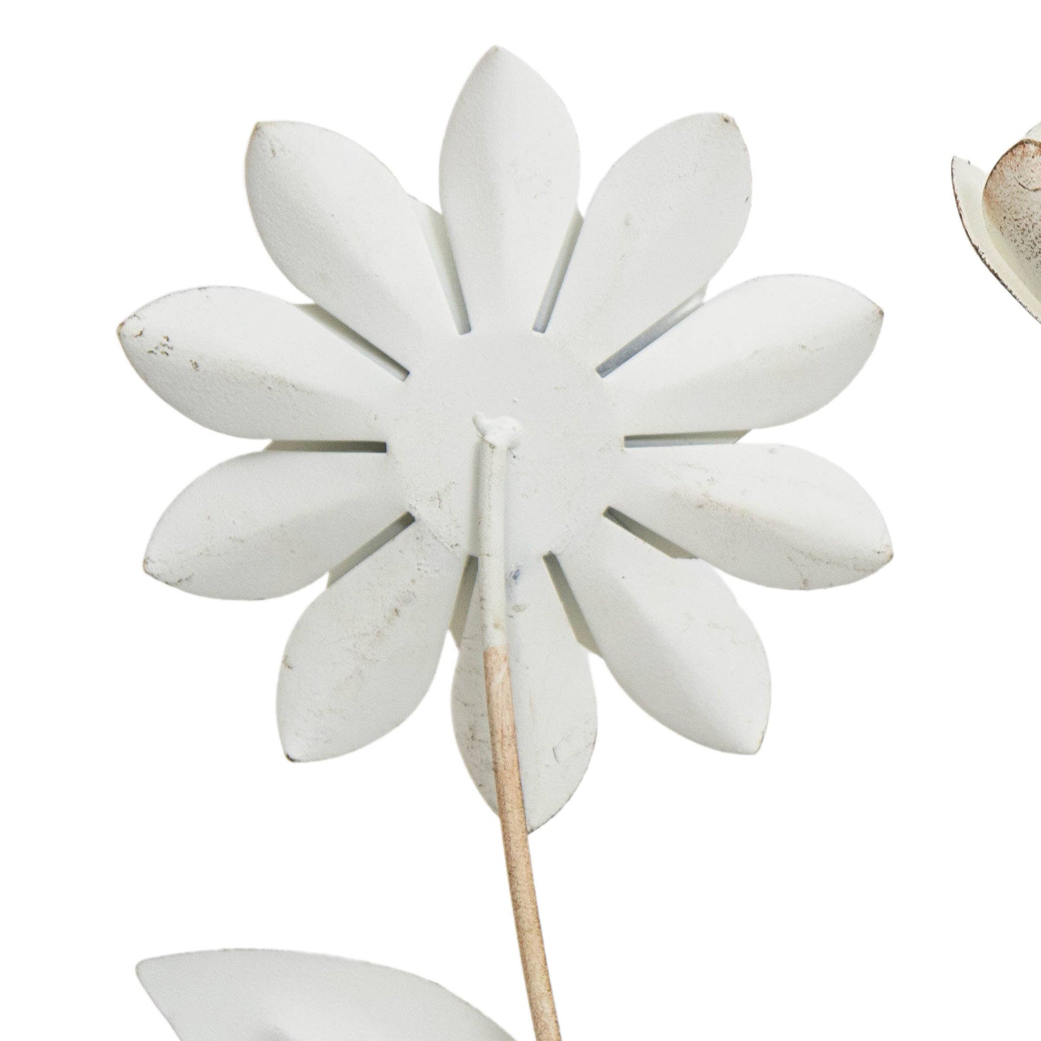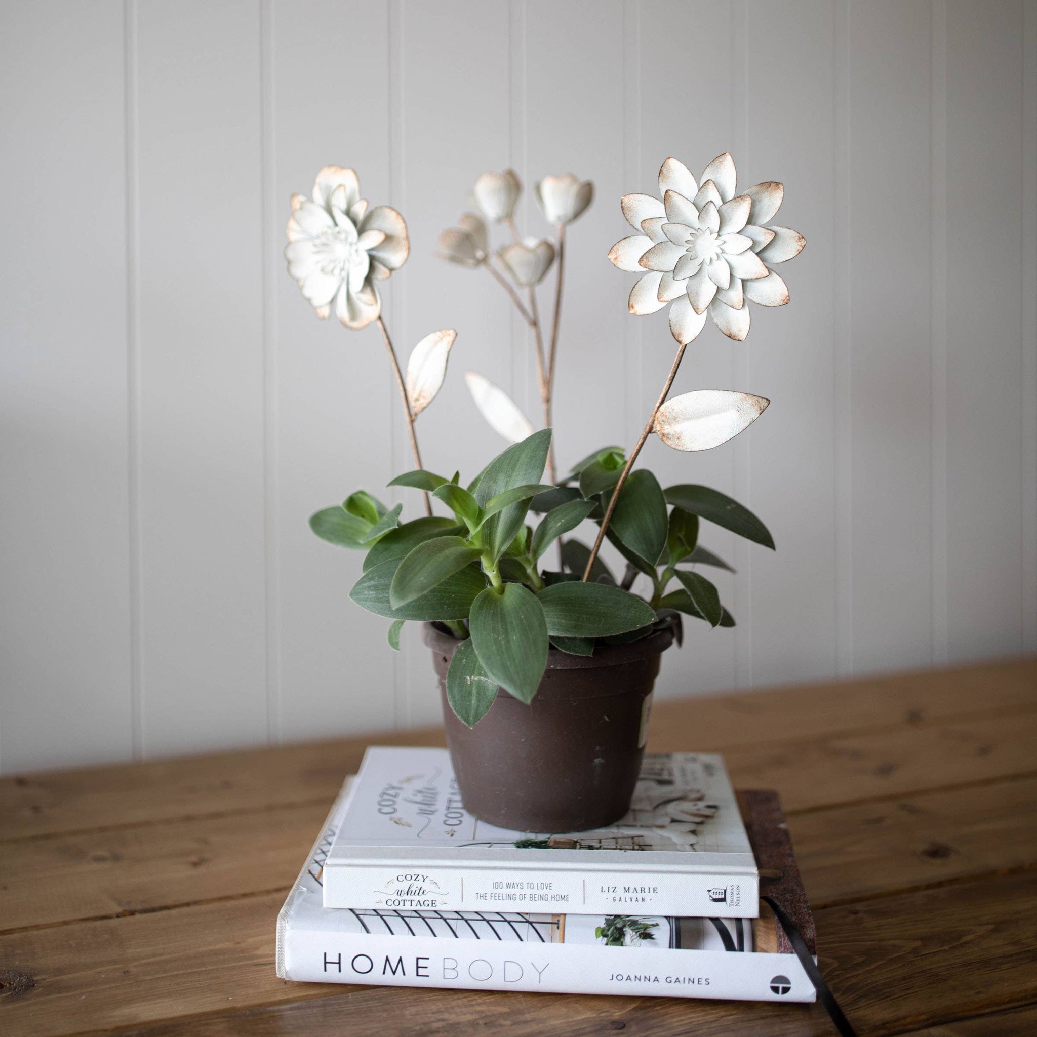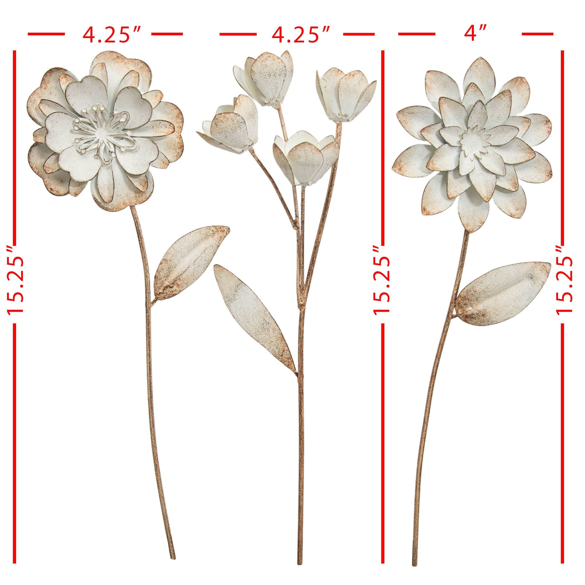 A matte white finish is the base for an antiqued bronze brushing over the three botanical stems, each featuring a different flower. Their color makes these stems a neutral yet beautiful accent. Create a bouquet with all three or use as planter pot stakes.