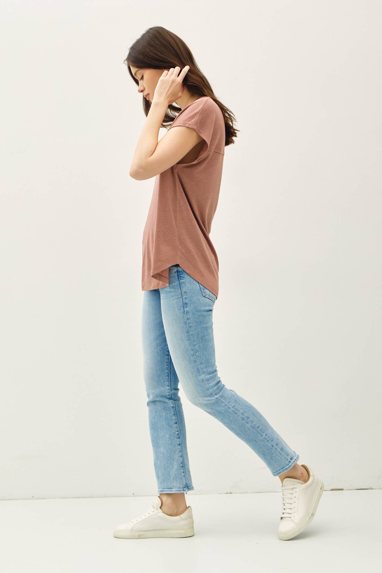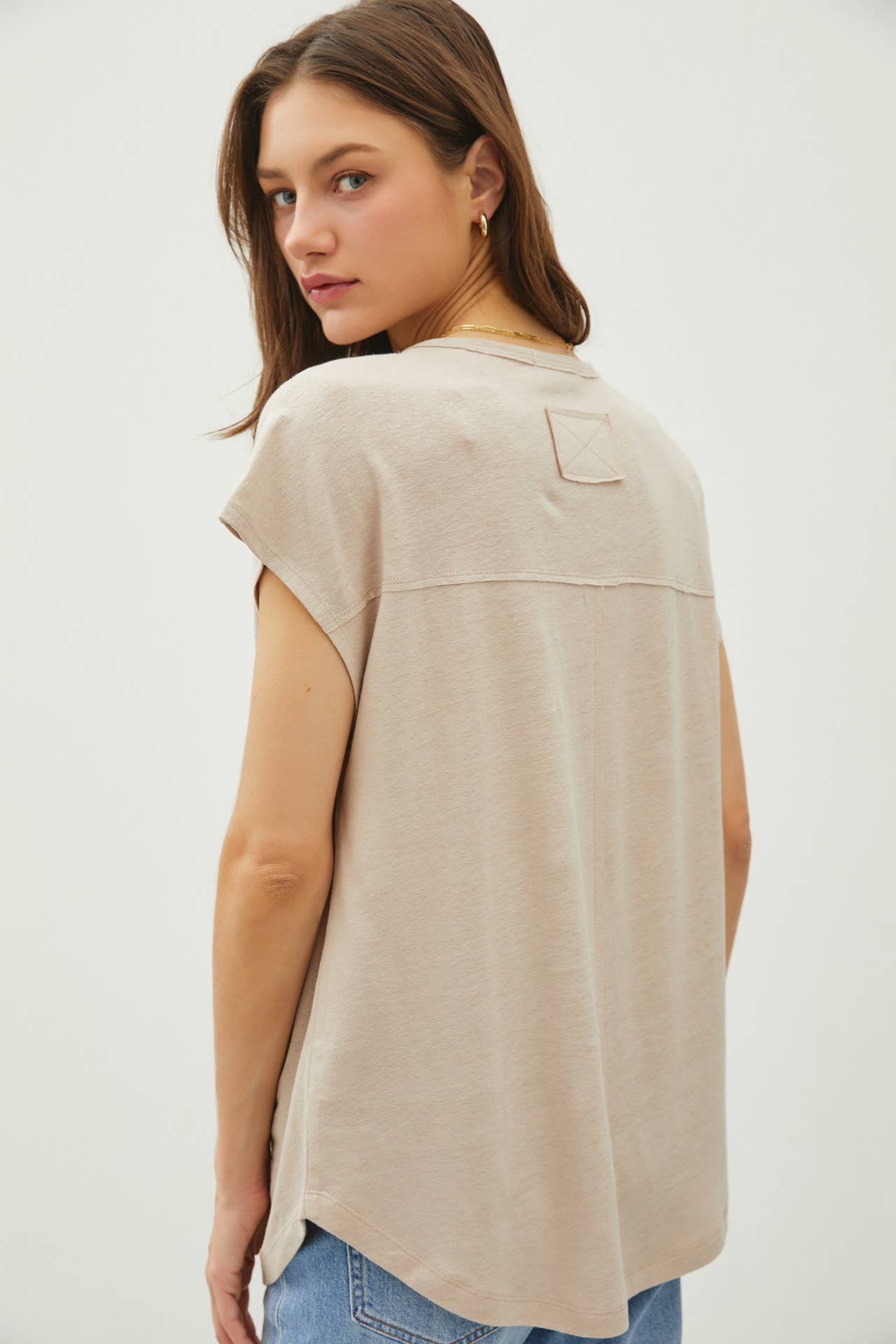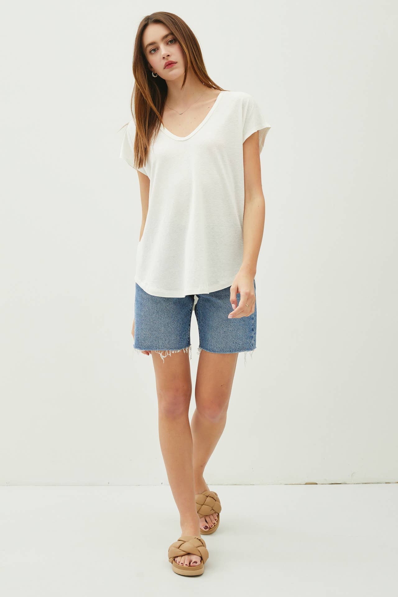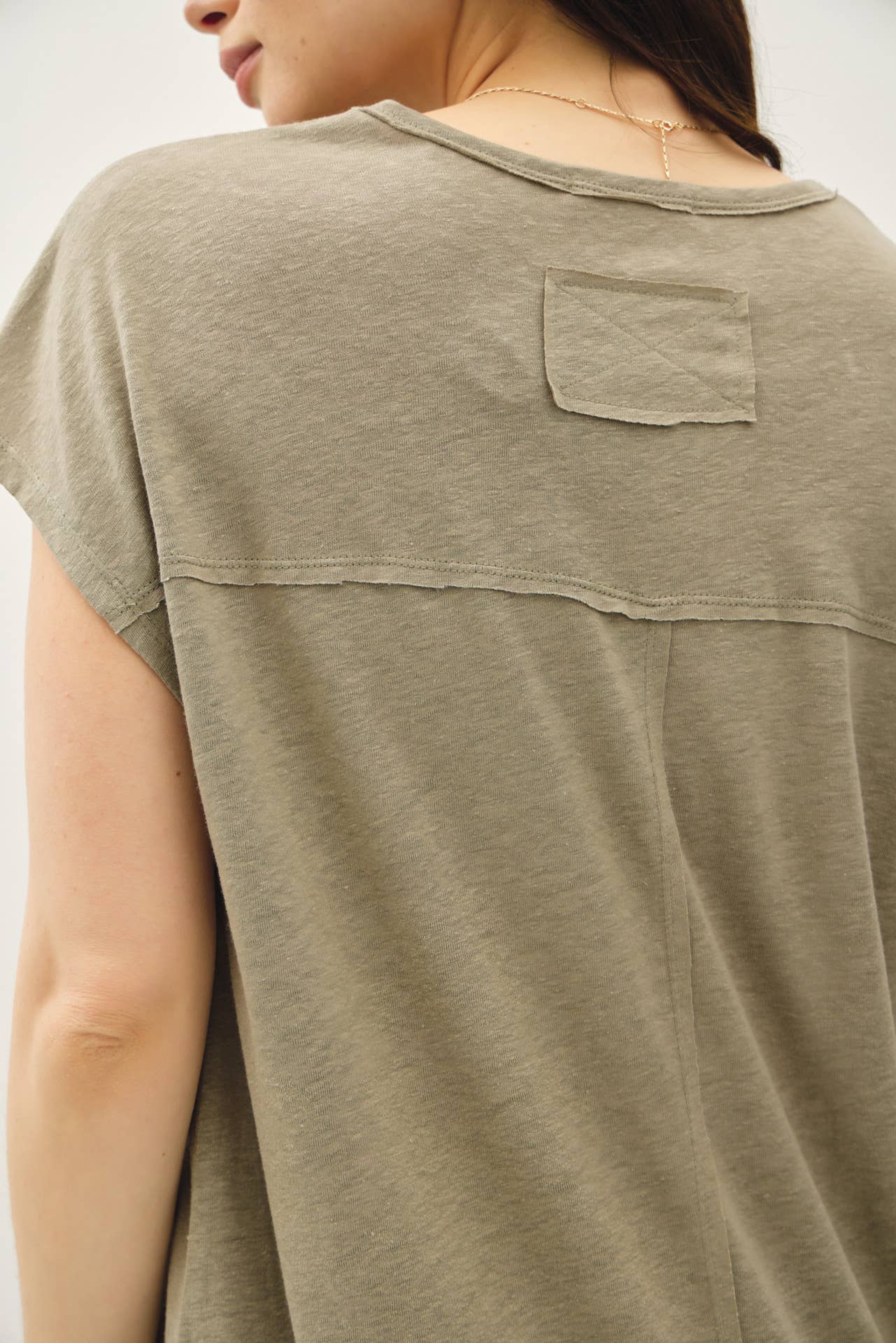 * LINEN * T-SHIRT * BACK RAW EDGE DETAIL * BACK YOKE SEAM * CENTER BACK SEAM * FLOWY * SLIGHTLY CAPPED SHORT SLEEVE * V-NECKLINE * BOXY FIT * ROUND HEM * BELOW HIP LENGTH