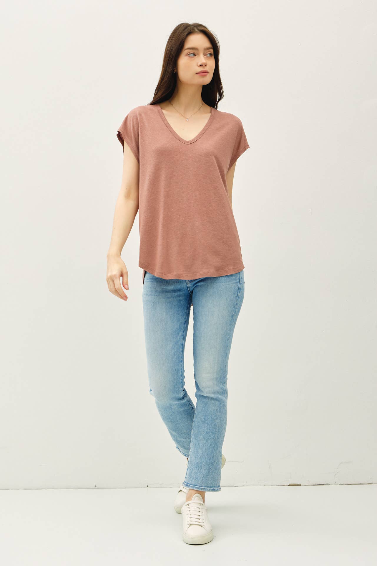 BACK RAW EDGE DETAILED V-NECK LINEN TEE : Guava Punch