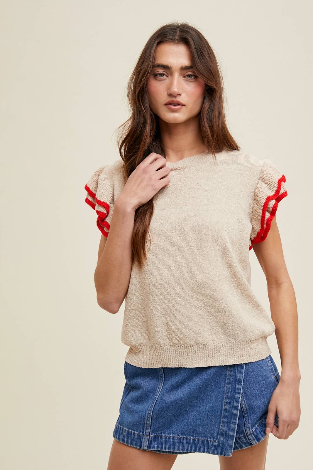 DOUBLE LAYERED RUFFLE SWEATER TOP - SHORT SLEEVE, LIGHTWEIGHT, ROUND NECK, CASUAL 100% POLYESTER * Due to lighting and differences in monitors, actual colors may vary slightly from what appears online.