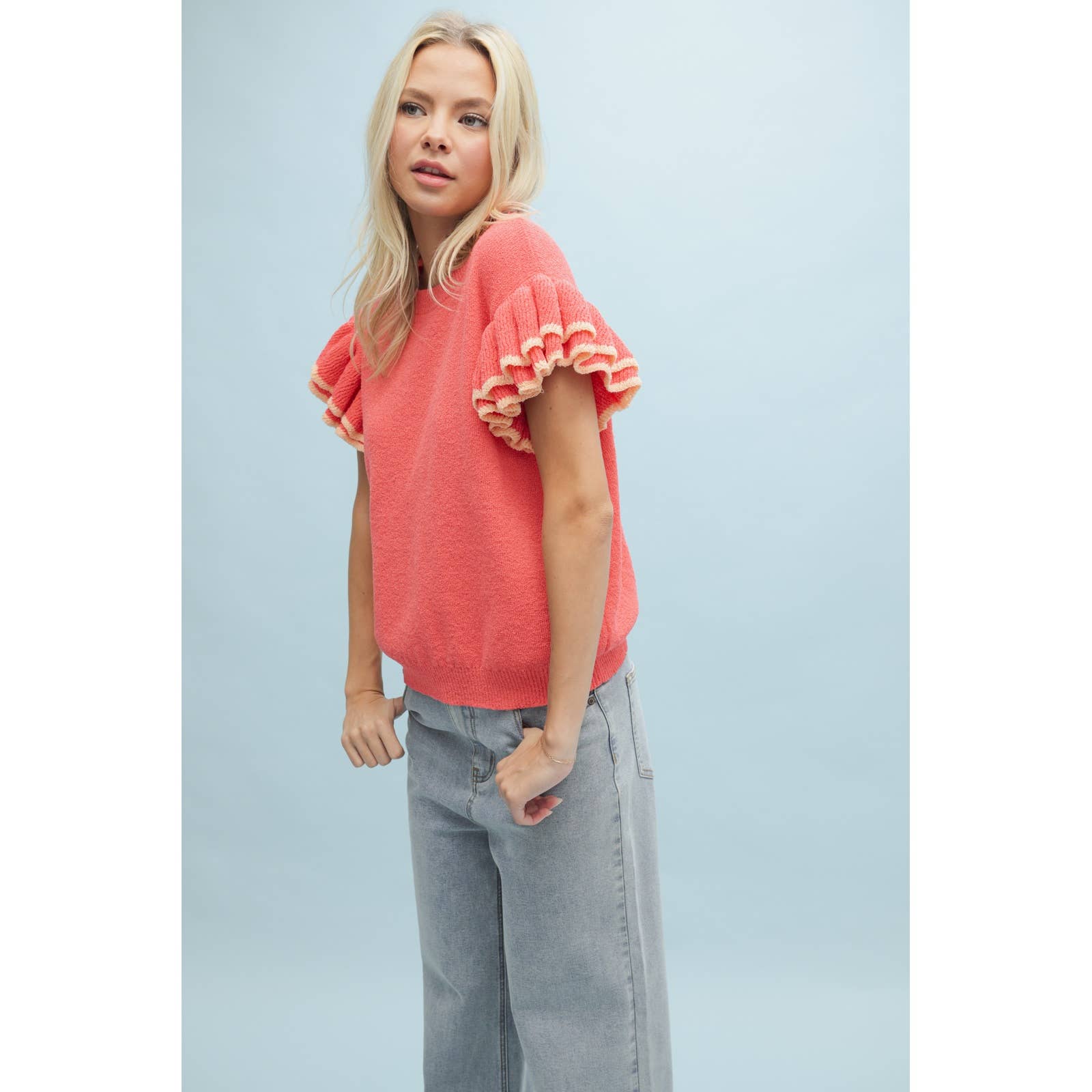 DOUBLE LAYERED RUFFLE SWEATER TOP / POPPY/CITRUS