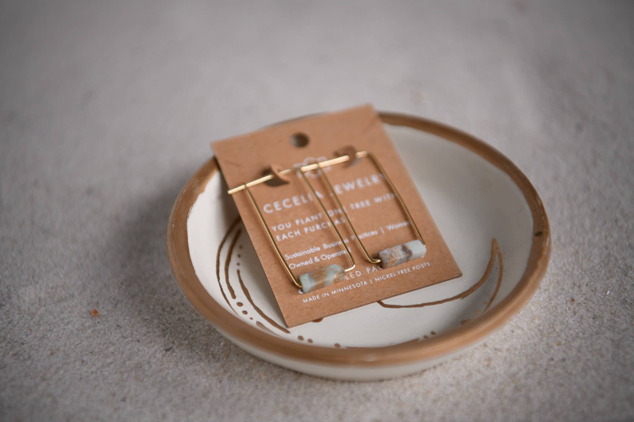 Shop our Eventide beaded rectangle hoop earring collection. These lightweight and versatile earrings are made with a gold-plated rectangle and are approximately 2.5" in length. Handmade in Minnesota. You plant one tree with each purchase.