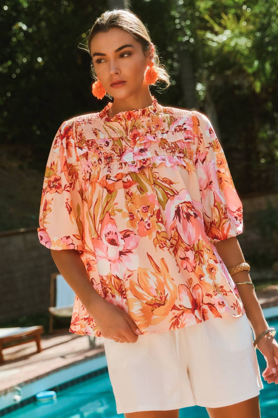 Floral printed half bubble sleeve blouse. Total Length: 28" Content: 97% Polyester, 3% Spandex