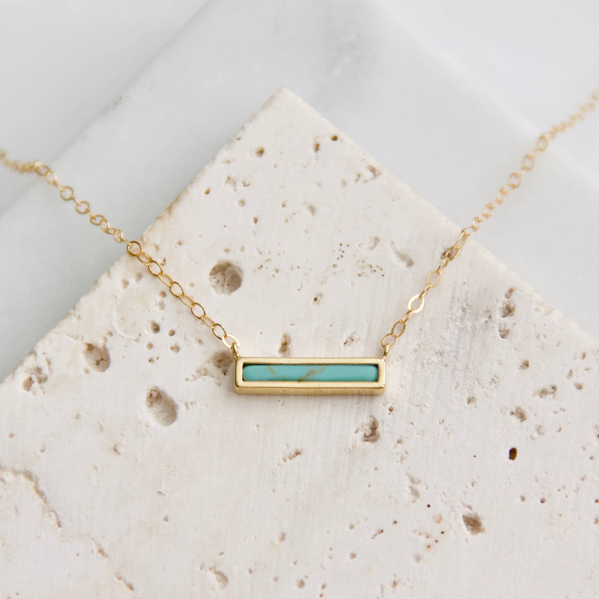 Dainty turquoise bar on a gold filled chain Perfect for everyday wear. Details: • MATERIAL: 18K gold plated bar, gold filled chain • PENDANT SIZE: 16x4mm • CHAIN LENGTH: 16" • CLASP STYLE: Spring ring • PACKAGING: Arrives on a branded 3x3" card