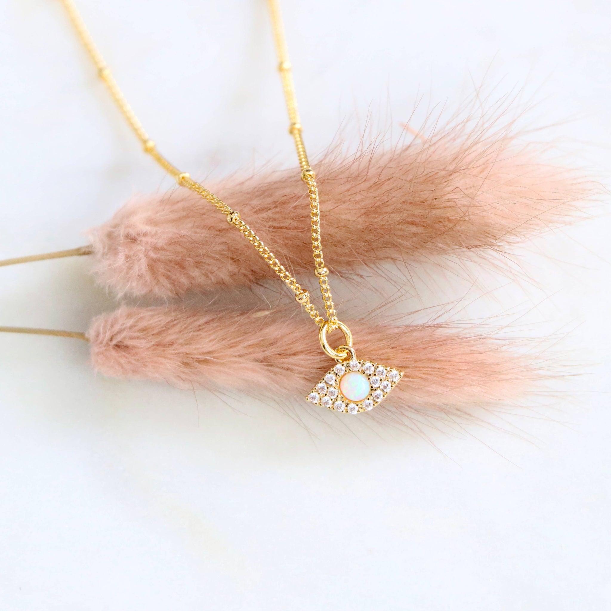 Opal and CZ Necklace Details: • MATERIAL: 18K gold plated over brass • PENDANT SIZE: approximately 12x8mm • CHAIN LENGTH: 16" gold plated chain • CLASP STYLE: spring Arrives on a 3x3" branded jewelry card