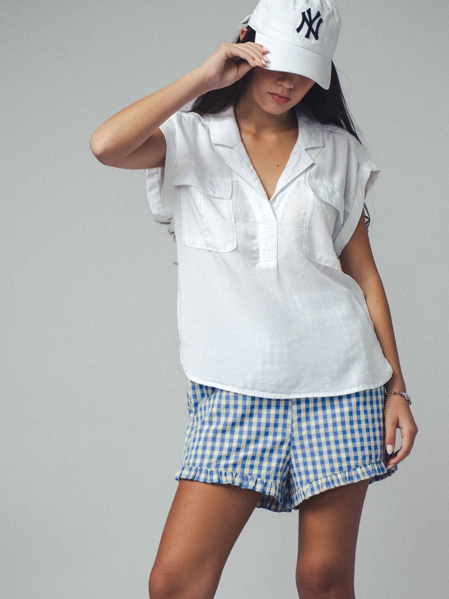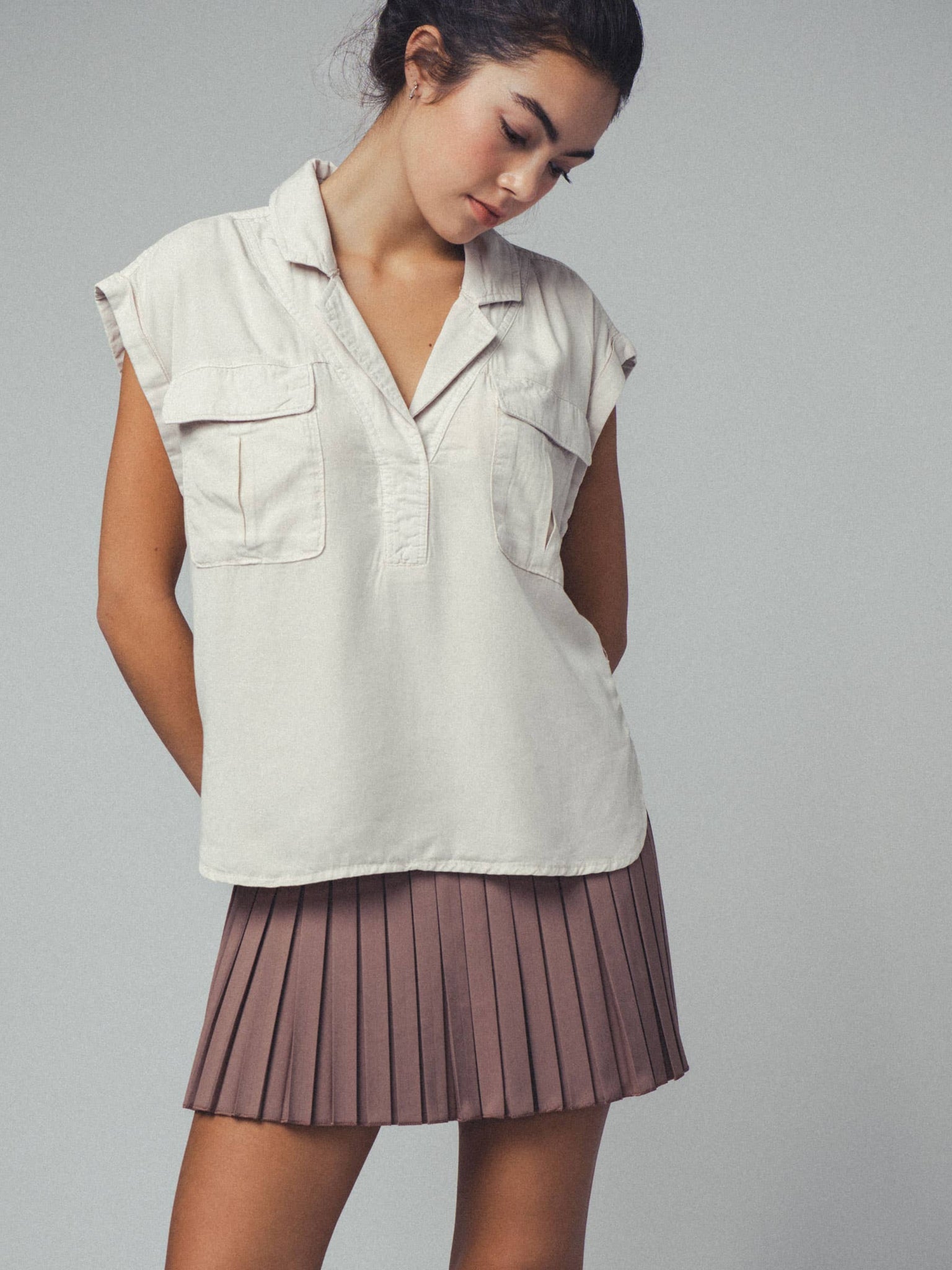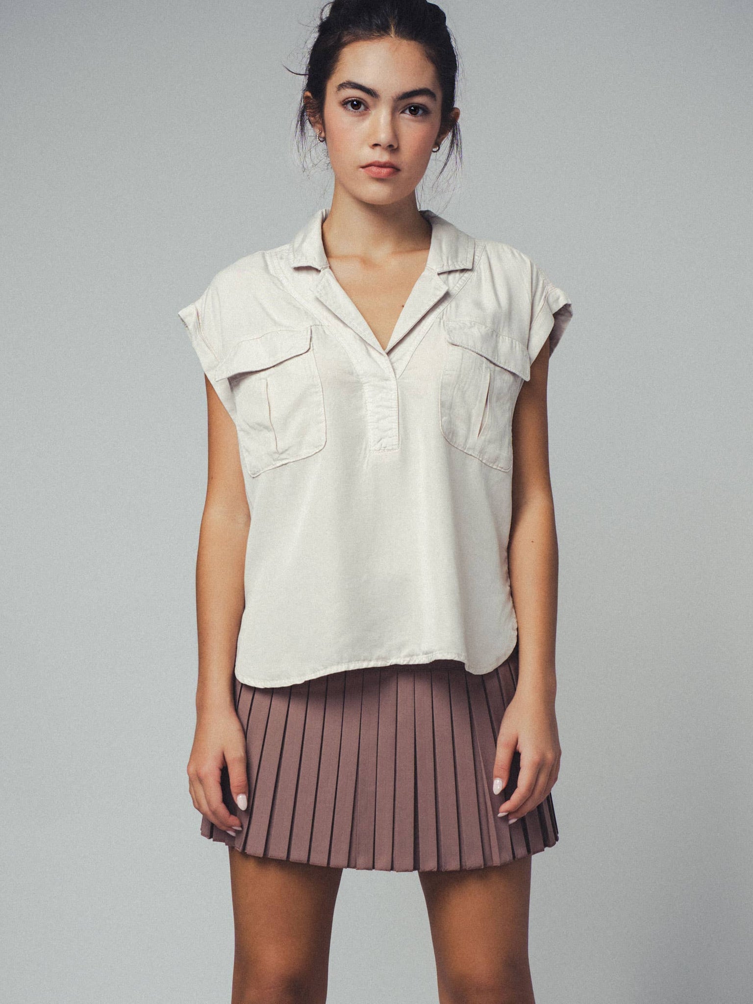 This lightweight top features a relaxed fit, rolled short sleeves, and Western-inspired details like dual front pockets and a collared neckline. Made from 100% Tencel, it offers softness and breathability, perfect for warm-weather styling.