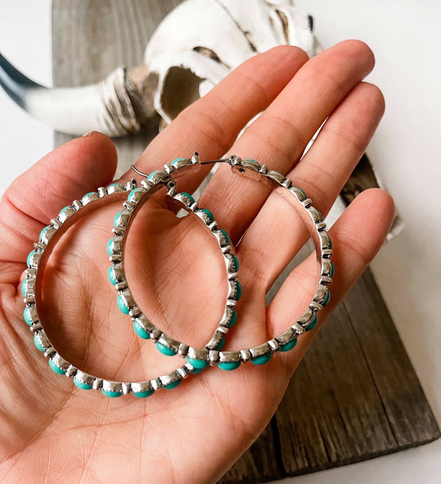 Navajo Hoop Earrings - Western Statement Earrings - Texture Earrings Turquoise Colored Stone Navajo Style Punchy Howdy Navajo Style Texture Hoop Earrings • 2” • Antique Silver & Turquoise Color